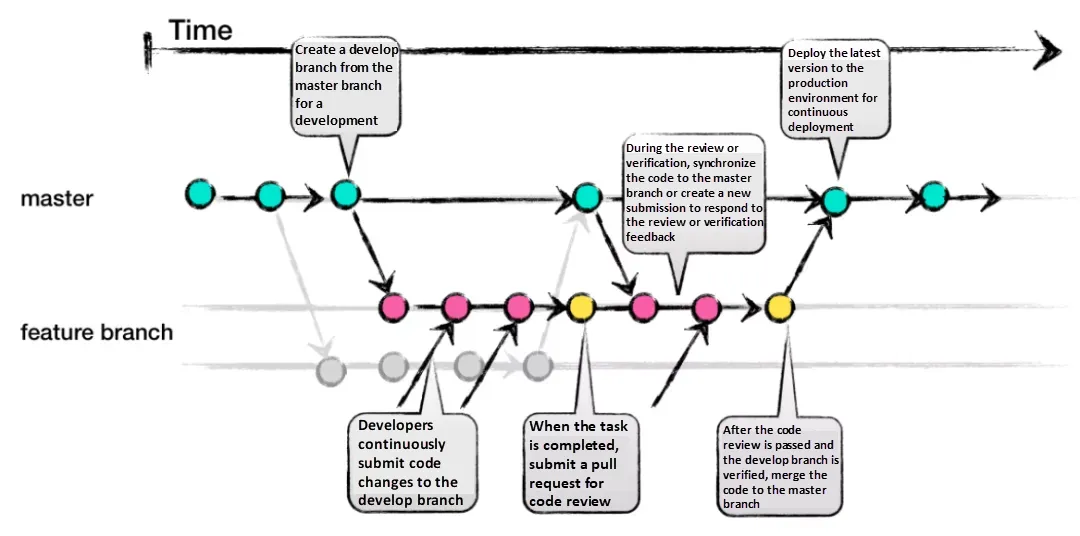 - master 브랜치는 항상 최신 상태이고, 항상 서비스중이라고 생각하면 된다.