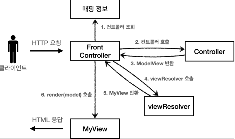 기본적인 구조는 V3와 같다. 대신에 컨트롤러가 ModelView 를 반환하지 않고, ViewName 만 반환한다